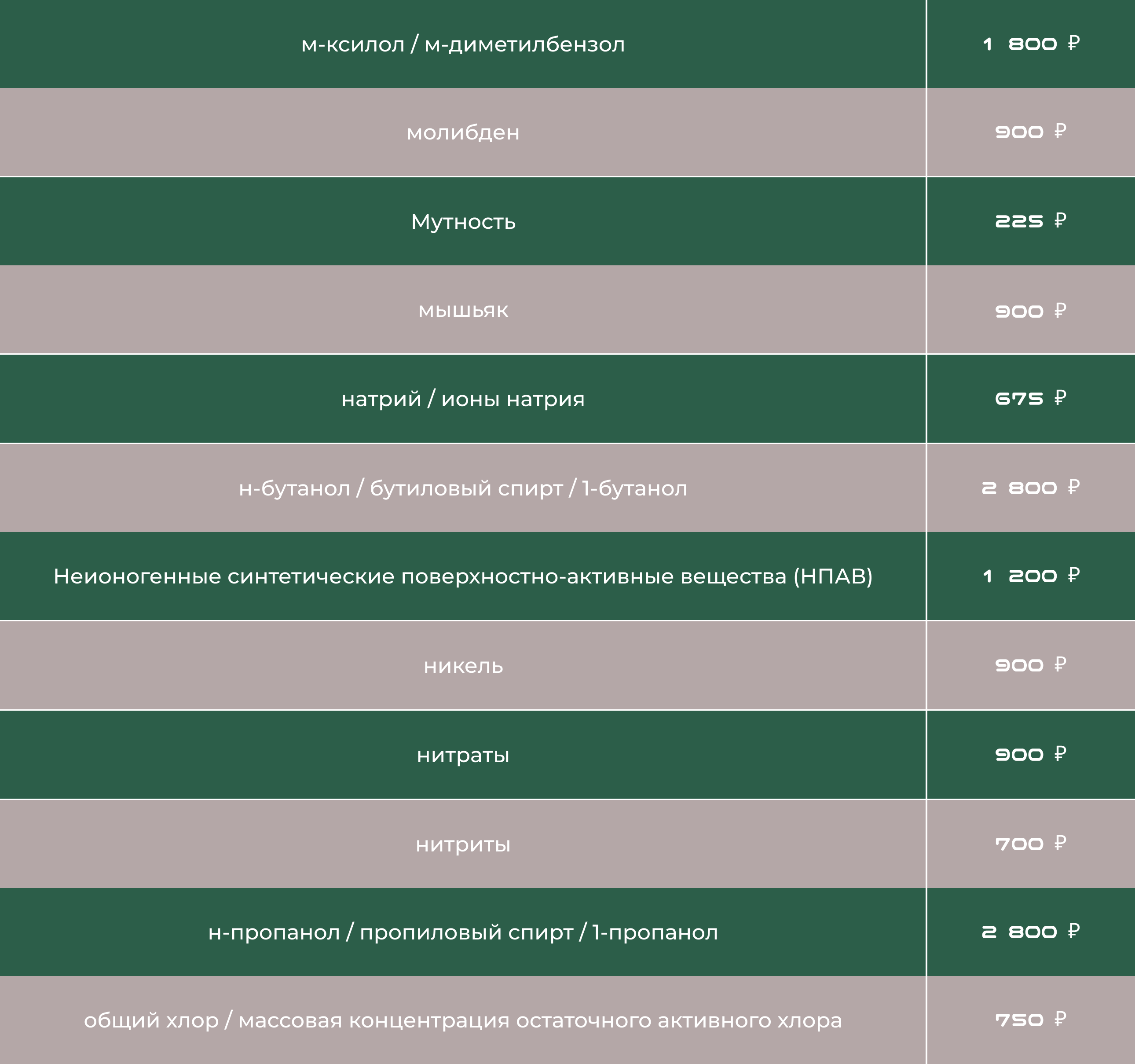 Температура, запах при 20 ºС, запах при 60 ºС, цветность, мутность, водородный показатель (рН), общая жесткость, сухой остаток, БПК5, ХПК, перманганатная, окисляемость, аммонийный азот, нитраты, нитриты, фосфатный фосфор, АПАВ, НПАВ, нефтепродукты, фенолы, железо, марганец, медь, свинец, ртуть, кадмий, цинк, никель, мышьяк, сероводород, сульфаты, хлориды, удельная суммарная альфа-активность, удельная суммарная бета-активность