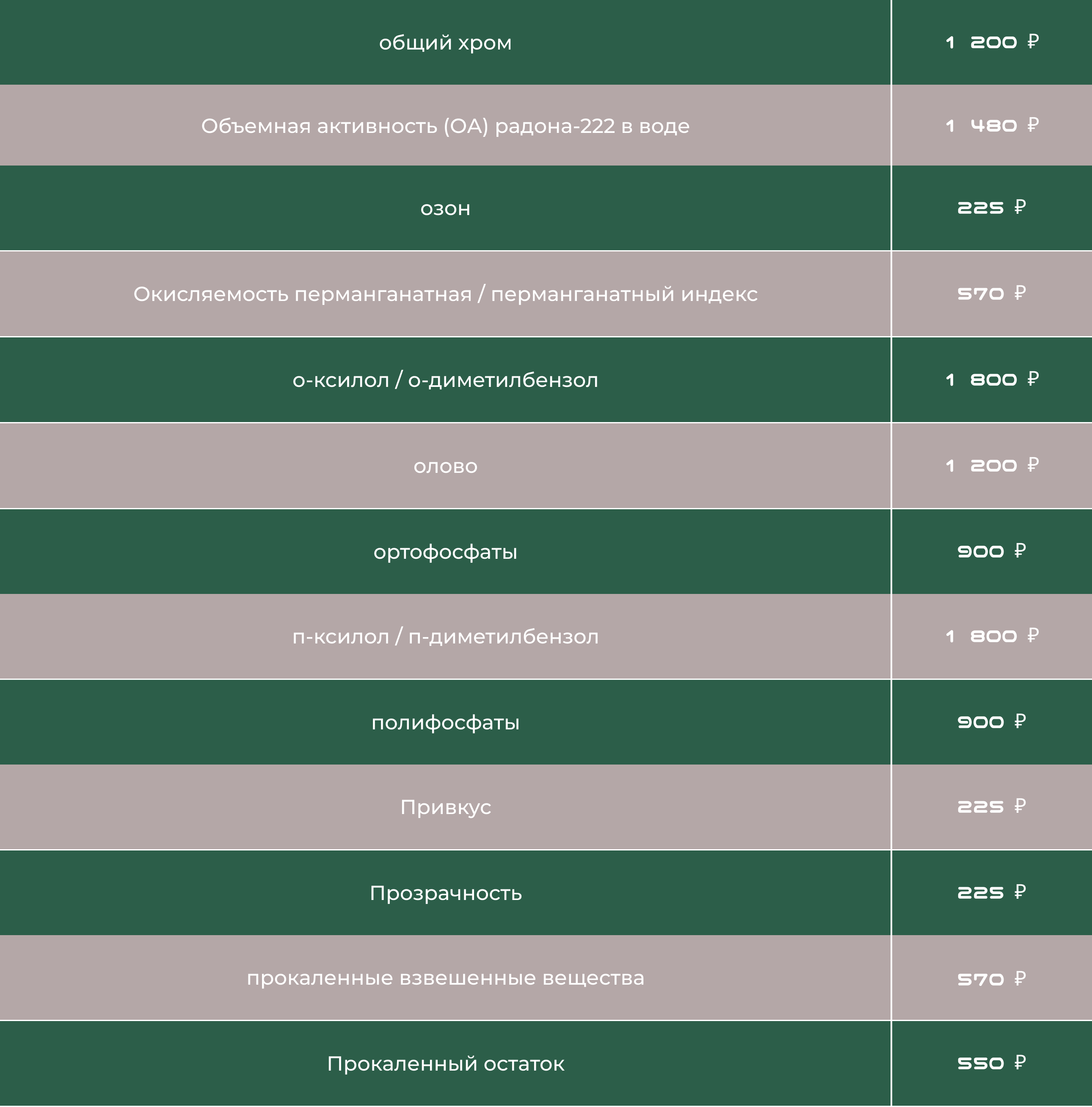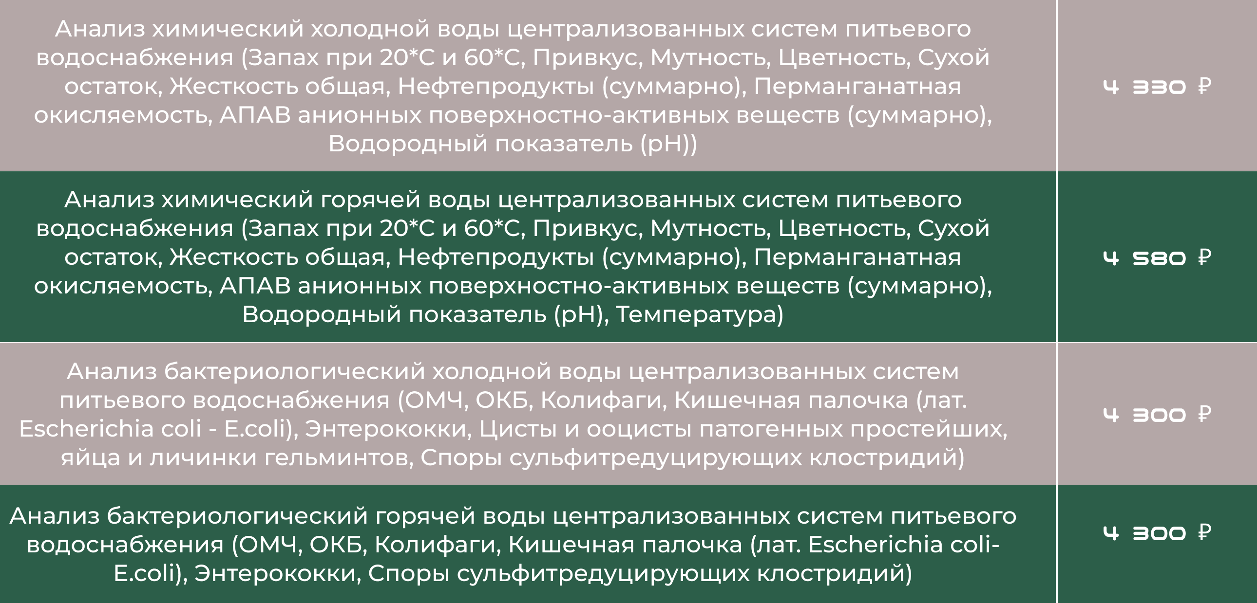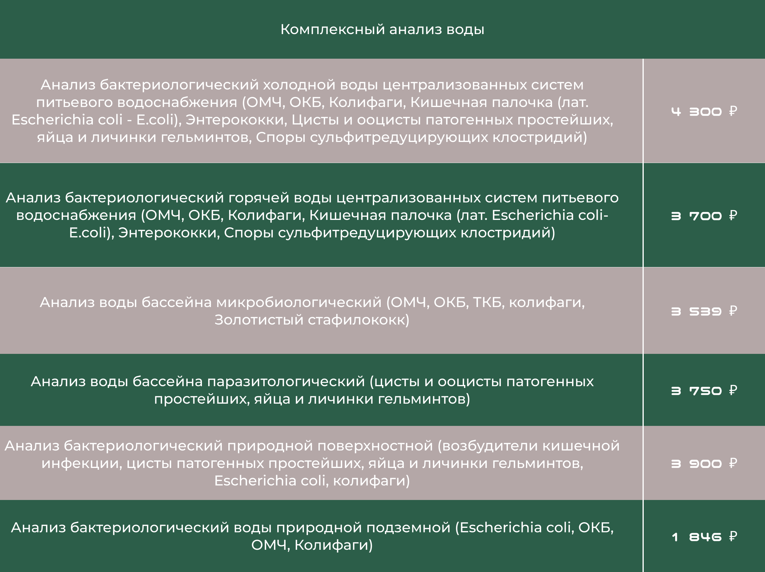 Аккредитованная лаборатория СПИЛЦ выполняет широкий спектр исследований качества воды по химическим, микробиологическим и радиологическим показателям из любых источников – водопровод, скважина, колодец, природные и сточные воды, воды бассейнов, джакузи и аквапарков, грунтовые, бутилированные, минеральные лечебно-столовые, вода дистиллированная.